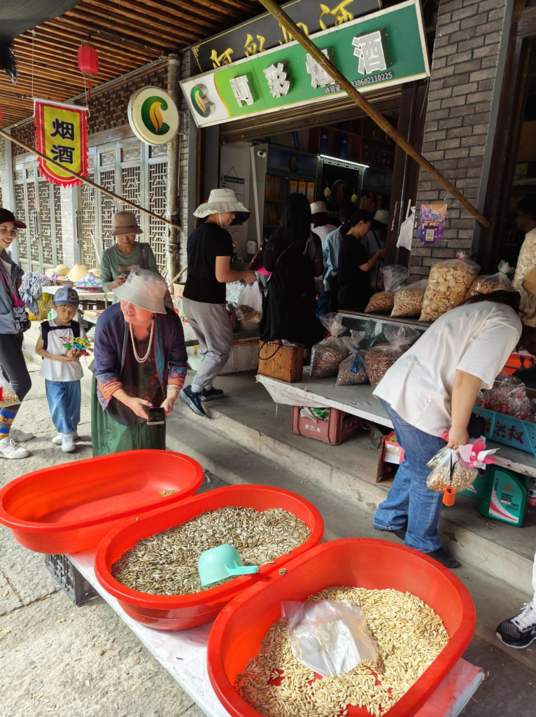 而后,嗅着喷香的瓜子味,循着戏调一般的叫卖,转角走进商铺中。街边喷香的瓜子,店中淳朴的卖家,一交一易将好客之情传达给外院游客。这样充满人间烟火气的小店,来丰惠不体验一把,不算来过。老师们有说有笑地走进店里,寻觅小吃,挑选商品。