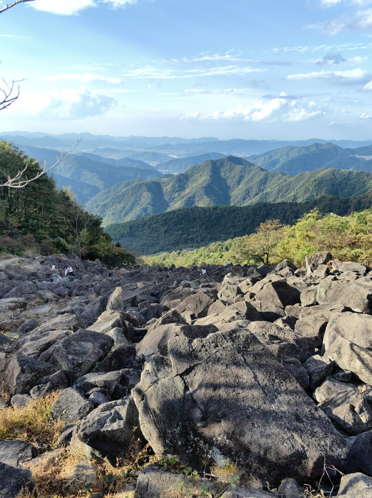覆卮山山峦起伏,云雾缭绕,更有一条石河巨石滚滚,顺坡而下,气势壮观,此处为第四纪冰川。分明是石头,望之却像涌浪滔天的滚滚河流,从山顶一直奔污到山麓,气势磅礴。站在山顶往下看,十二条由巨大鹅卵石汇成的石河,蔚为壮观。置身其间,则石浪滔天,虽然巨石纹丝不动,其恢弘跌宕的气势给人以地动山摇之感。