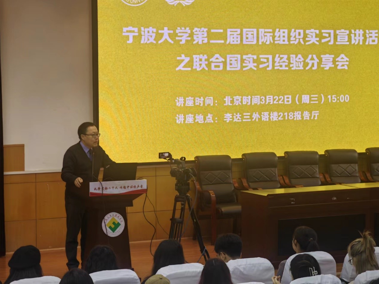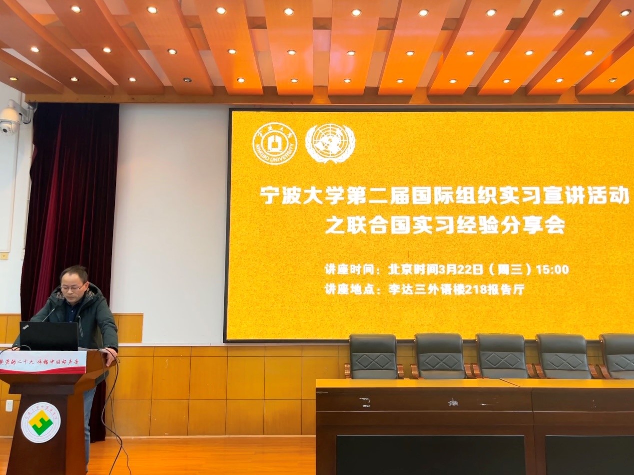 第二届国际组织实习宣讲活动之联合国实习经验分享会在李达三外语楼218报告厅顺利举办。身在异国工作实习的宁大毕业生通过视频直播分享心得,与现场与线上的两百余名同学互动交流。