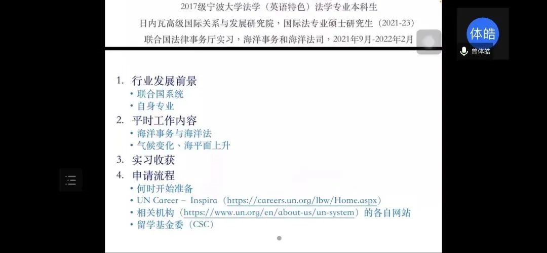 曾体皓从自身的专业背景出发,从行业发展前景层面与同学们分享联合国的组织系统及自身专业。对于平时工作的内容,他为大家客观介绍了海洋事务与海洋法,并分析了全球气候变化问题下自身专业的重要性。对于实习收获,他认为受疫情影响下的国际工作,虽然更多依靠线上完成,但是正因为这样,他可以兼顾实习工作以及学习生活。他建议大家专注于提升自己的专业能力,并指出同学们需要不断丰富自身的兴趣爱好,这样才能明确自身发展前景。