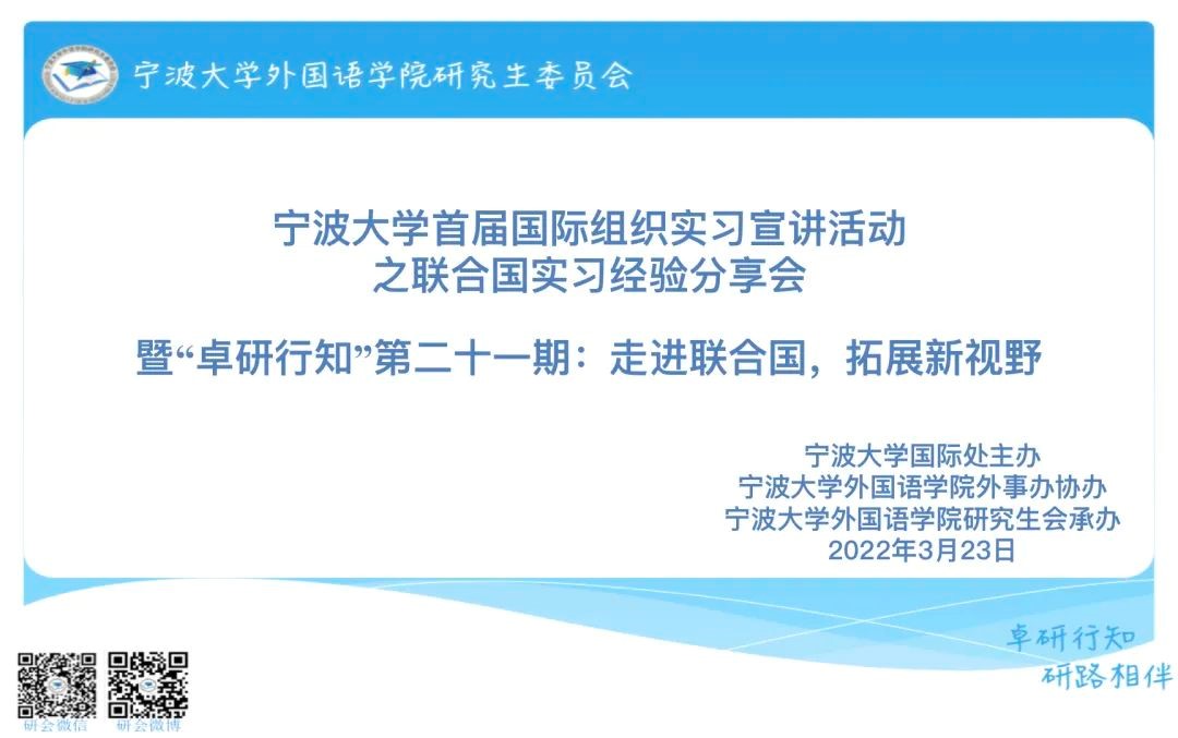 首届国际组织实习宣讲活动之联合国实习经验分享会暨“卓研行知”第二十一期:走进联合国,拓展新视野顺利举办。本活动线上线下双联动,线下在李达三外语楼422会议室举行,线上使用腾讯会议同步直播。本期特别邀请做爱