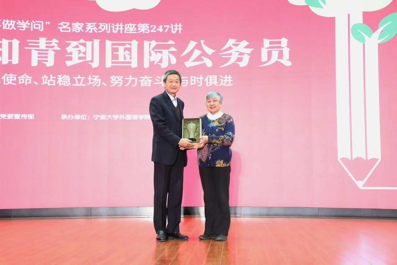 徐亚男大使以《从知青到国际公务员——牢记使命、站稳立场、努力奋斗、与时俱进》为题,深情回忆了自己从知识青年到外交官的奋斗历程。她分享了自己在农村插队劳动的艰苦经历,以及这段经历如何磨炼了她的意志,坚定了她为党、为国家、为人民利益而奋斗的决心。徐大使还提到了自己不断求学的经历,从杭州大学外语系英语专业毕业,到攻读新西兰维多利亚大学研究生和英国兰开斯特大学外交学硕士,不断提升自己的专业素养和国际视野。她鼓励宁大青年学生要不忘初心、牢记使命,艰苦奋斗,努力学习,为实现中华民族伟大复兴的中国梦贡献自己的力量。