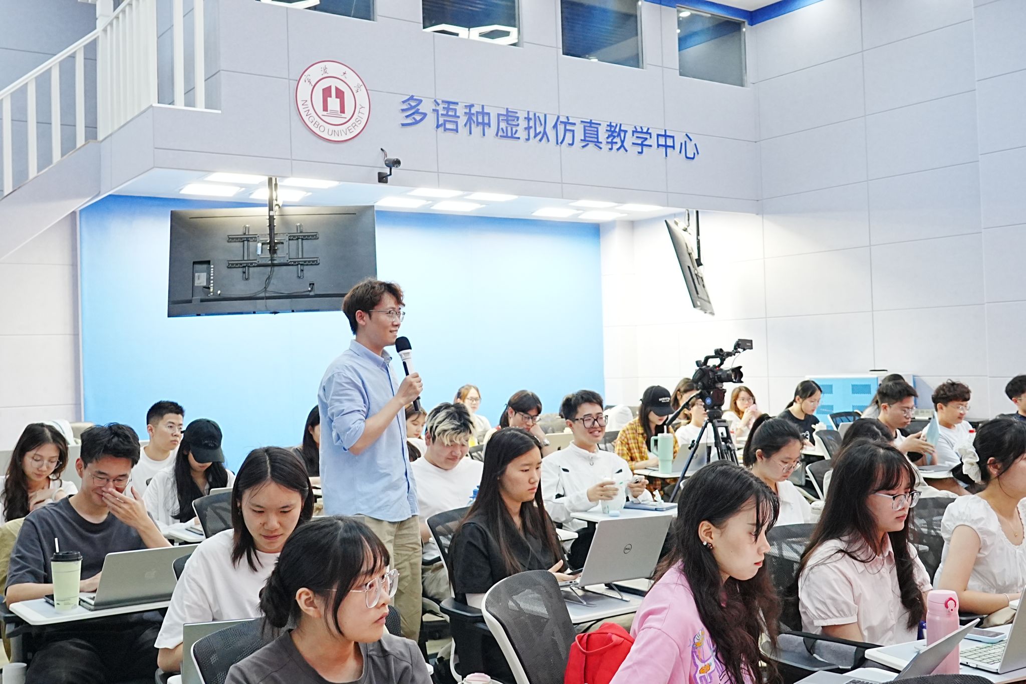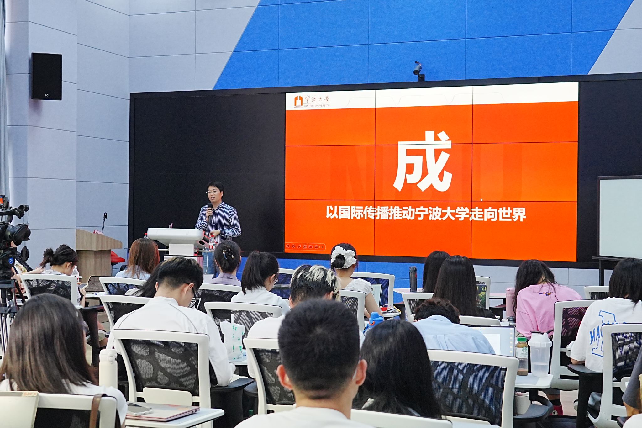 最后,郑老师特别提到,学校当前正在积极推进国际传播基地建设,已与环球网、宁波晚报、宁波电视台等多家媒体建立深度融合合作机制,为内容创作与传播提供了坚实平台与丰富资源。他鼓励同学们立足时代前沿,主动参与创作实践,运用多语种讲好宁大故事,积极推动做爱