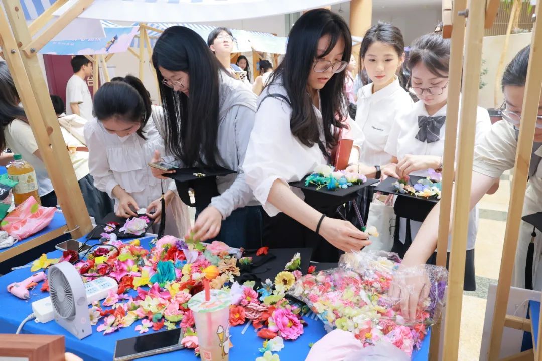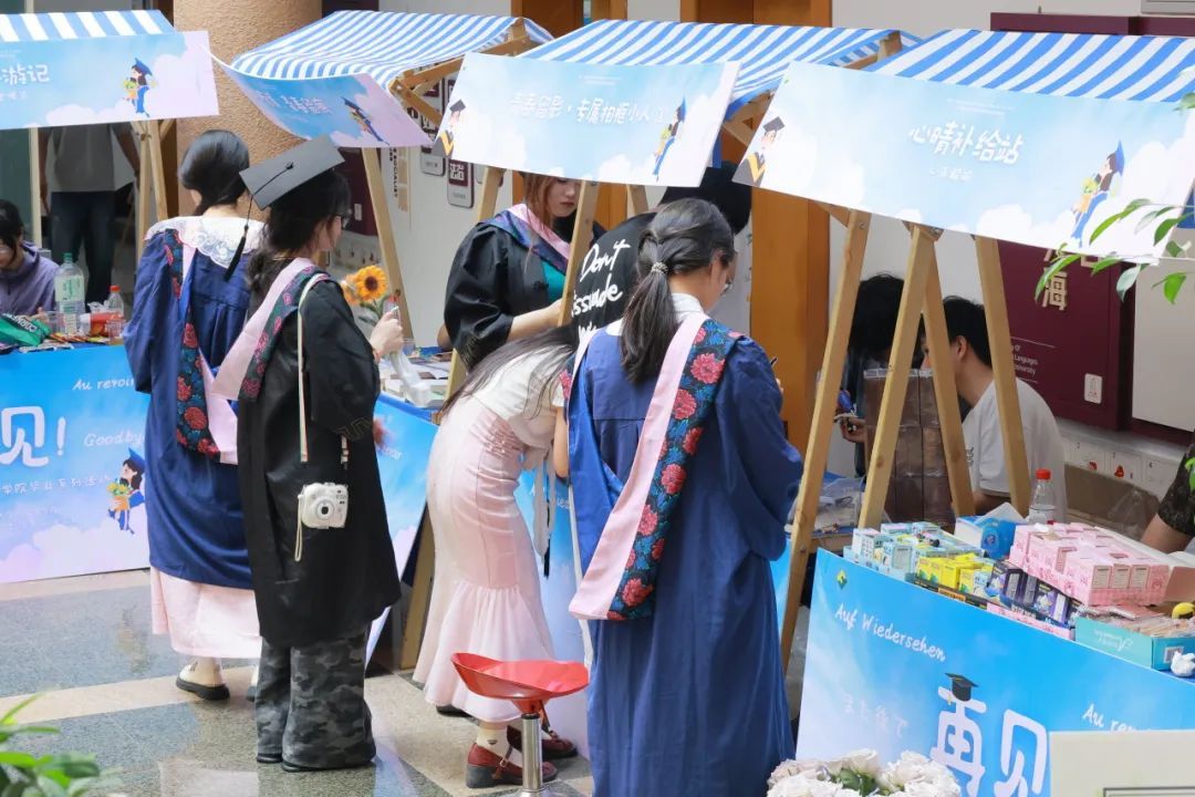 活动当天,李达三外语楼大厅化身为多元文化集市,20个主题摊位从清廉教育、职业赋能、心理帮扶、校风院风、中外文化体验、旧物流转等纬度出发,各具匠心:“青衿守廉·毕业清风展”,展出毕业生创作的廉洁主题绘画、书法等作品并同步开展清廉宣讲,为毕业生系好廉洁“第一粒扣子”;“求职加油站”邀请四家知名名企现场指导,为毕业生就业赋能增效;“出境无忧·12367指引站”提供跨境事务全流程服务;“心晴补给站”通过专业心理咨询师、心理知识问答、宠物疗愈等方式帮助毕业生正确开展心理疗愈;学士帽、帆布袋拓印、专属相框小人、漆扇和扭扭棒五大DIY板块帮助毕业生自定义独具匠心的毕业纪念礼物;“舌尖环游记”汇聚中外美食,用味觉传递文化交融;“记忆银行”以“李达三外语楼知多少”的快问快答帮助毕业生重忆学生时代点滴,用母院文创产品,助力毕业生留存大学美好。