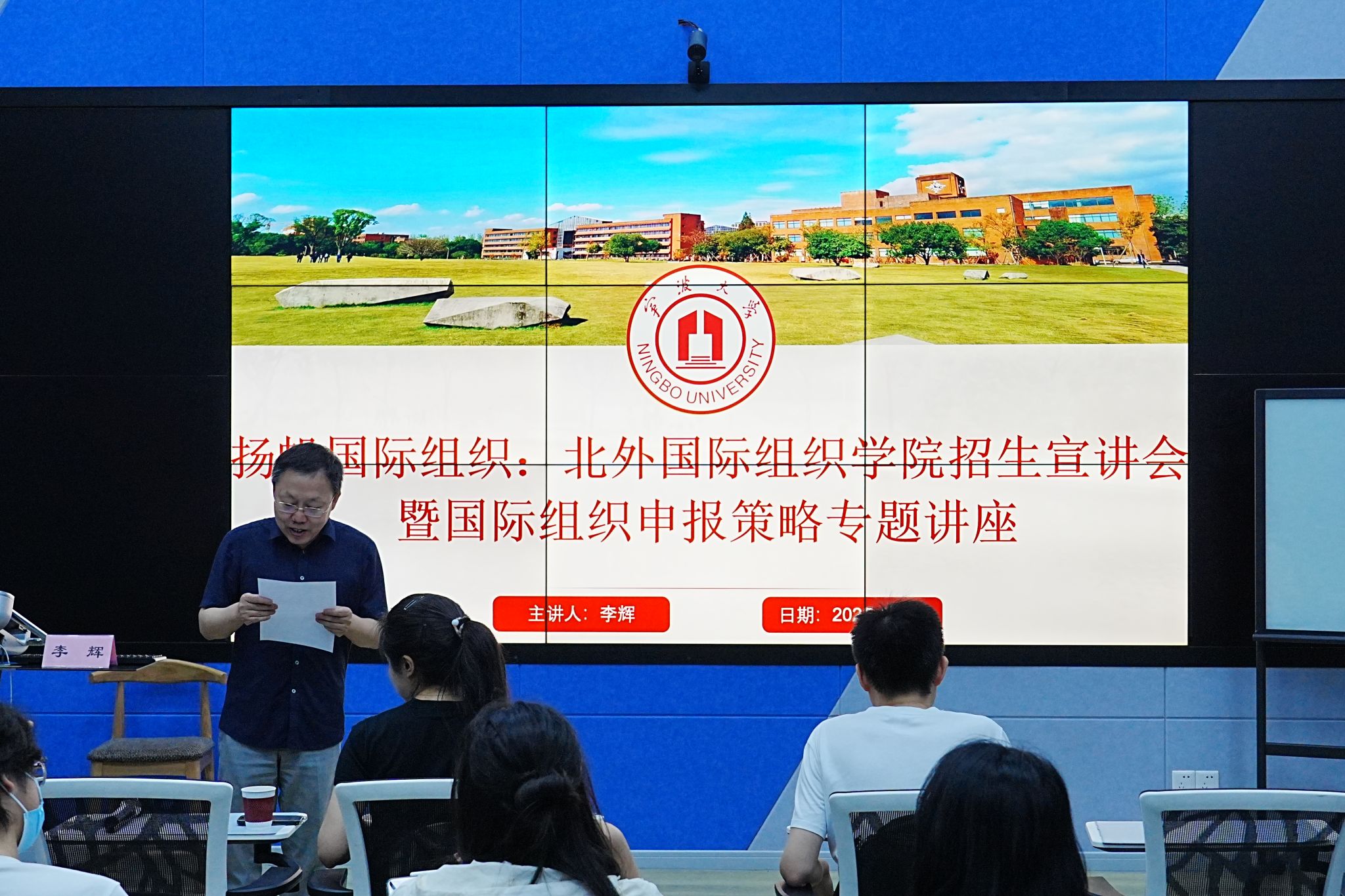 北外国际组织学院招生宣讲会暨国际组织申报策略专题讲座在李达三外语楼210实验室举行,面向宁大外语学子,系统介绍国际组织人才培养体系。张陟副院长主持讲座。