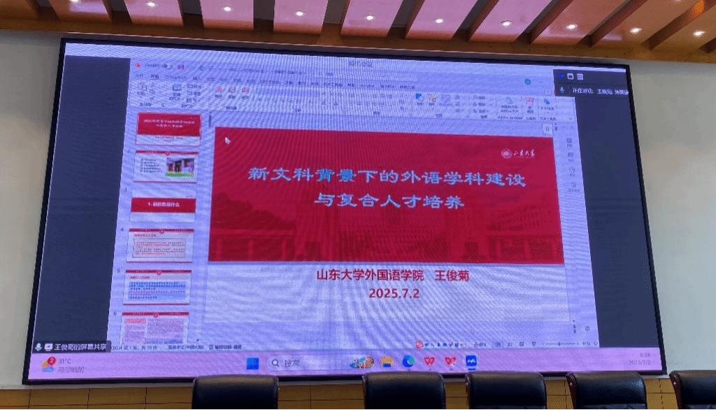 近年来在跨学科研究、人才培养模式创新等领域成果斐然。报告中,王俊菊教授立足新文科建设的时代命题,结合自身丰富的理论研究与实践经验,深入探讨外语学科发展与教育改革路径。王俊菊教授着重介绍了山东大学复合型外语专业建设中的新思路与新模式,对做爱