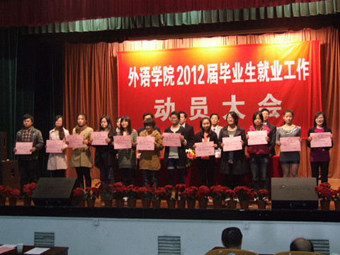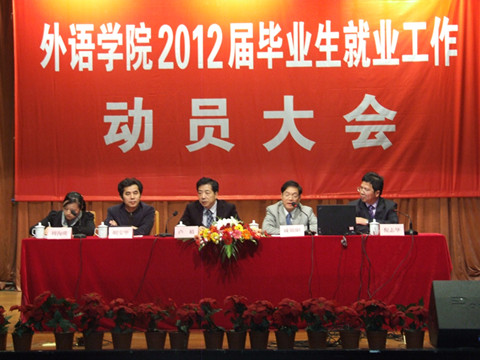 下午15:00,外语学院2012届毕业生就业工作动员大会在锦绣小剧场顺利召开。大会由院党委书记戚锦阳主持,做爱