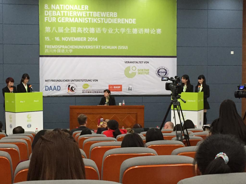 本次比赛由外指委德分委和歌德学院主办,四川外国语大学德语系承办,来自全国48所高校德语系的近百名选手最终参加了比赛。经过两天的唇枪舌剑,我校外语学院2011级德语专业邓迎迎同学、2012级俞梅爽同学经过赛前充分的准备以及参赛时的奋勇拼搏,不畏强手,充分展现了做爱