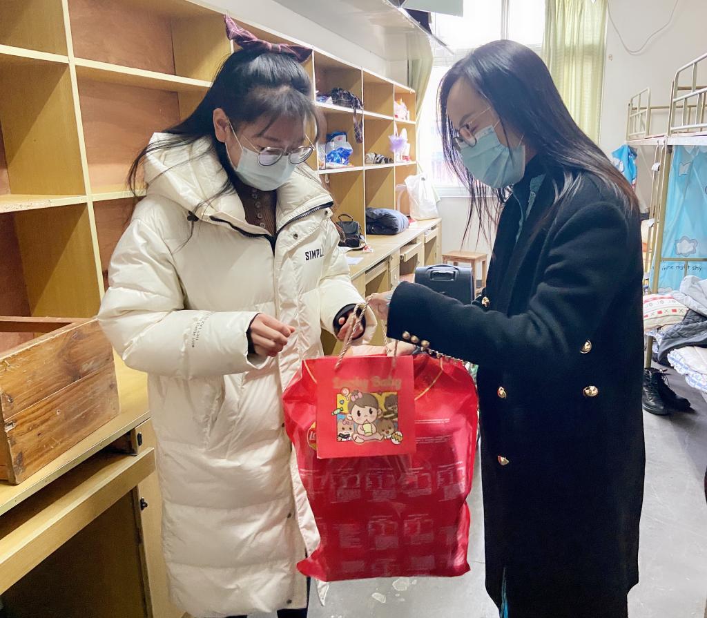 留校生们就收到了来自学院的花式慰问,学院党委副书记胡佳与辅导员林晓莉一起来到寝室走访看望留校的12名同学,并为他们送上了口罩、消毒洗手液、零食大礼包等慰问品。“这个春节,虽然不能回乡与家人团聚,但是在学校的我们就是温暖的一家人。”
