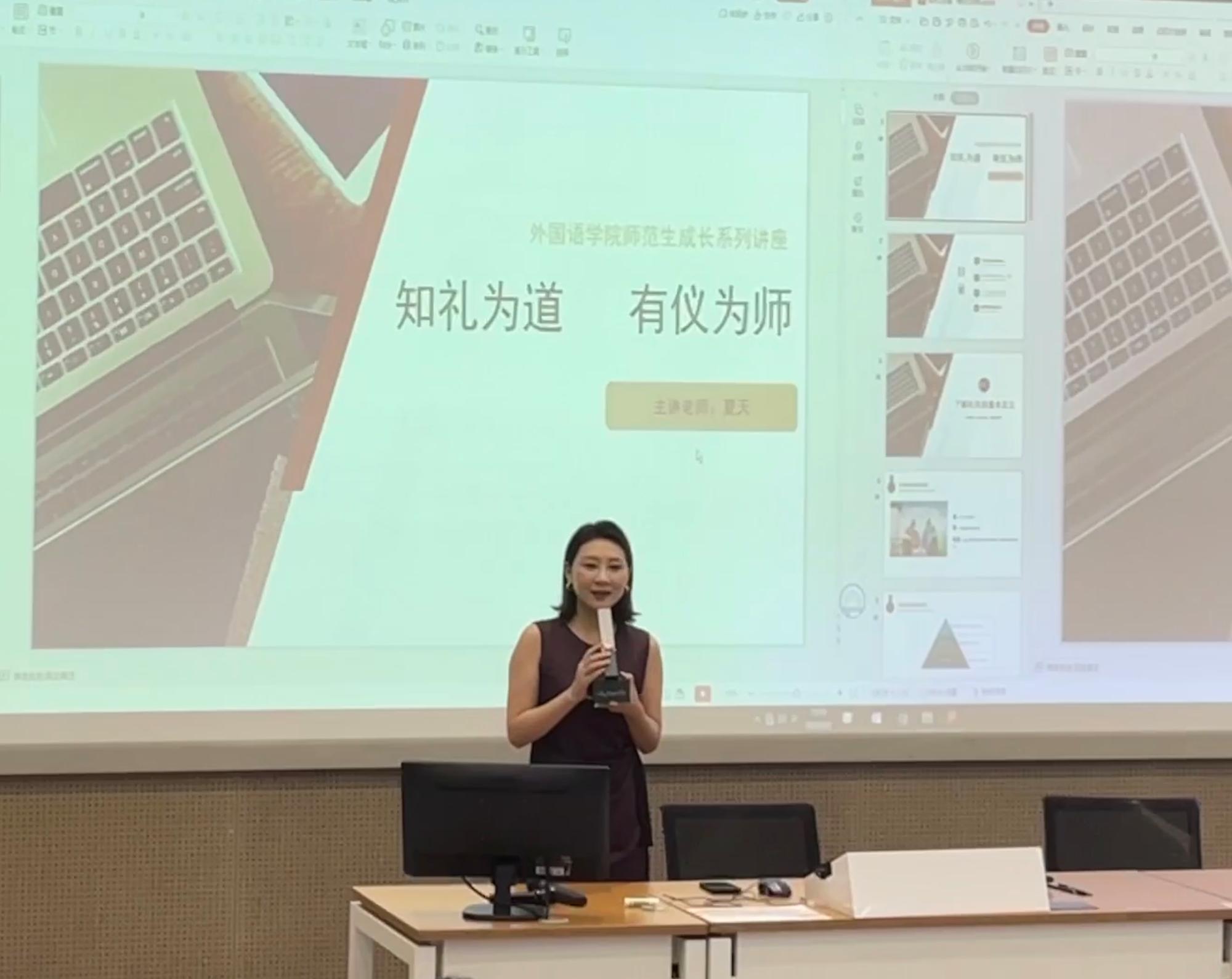 师范生成长系列讲座——“知礼为道 有仪为师”在本部阶三教室举行。国家认证形象管理师、高级礼仪培训师、优雅仪态导师夏天为2019级和2020级英语(师范)专业同学开设了主题讲座,并进行职前教师仪态训练。
