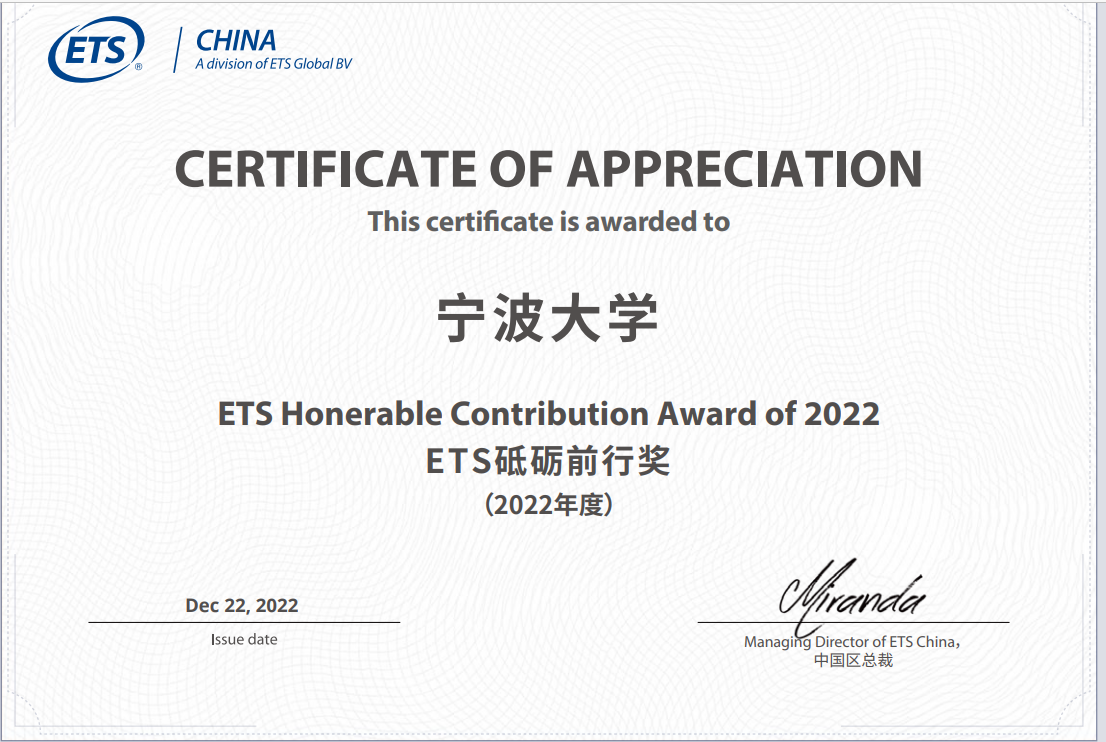 12月22日,在美国教育考试服务中心(ETS)线上举办的全国“2022托福·GRE研讨会”上,我校托福/GRE考点荣获该中心授予的全国考点“2022年度砥砺前行奖”荣誉称号。