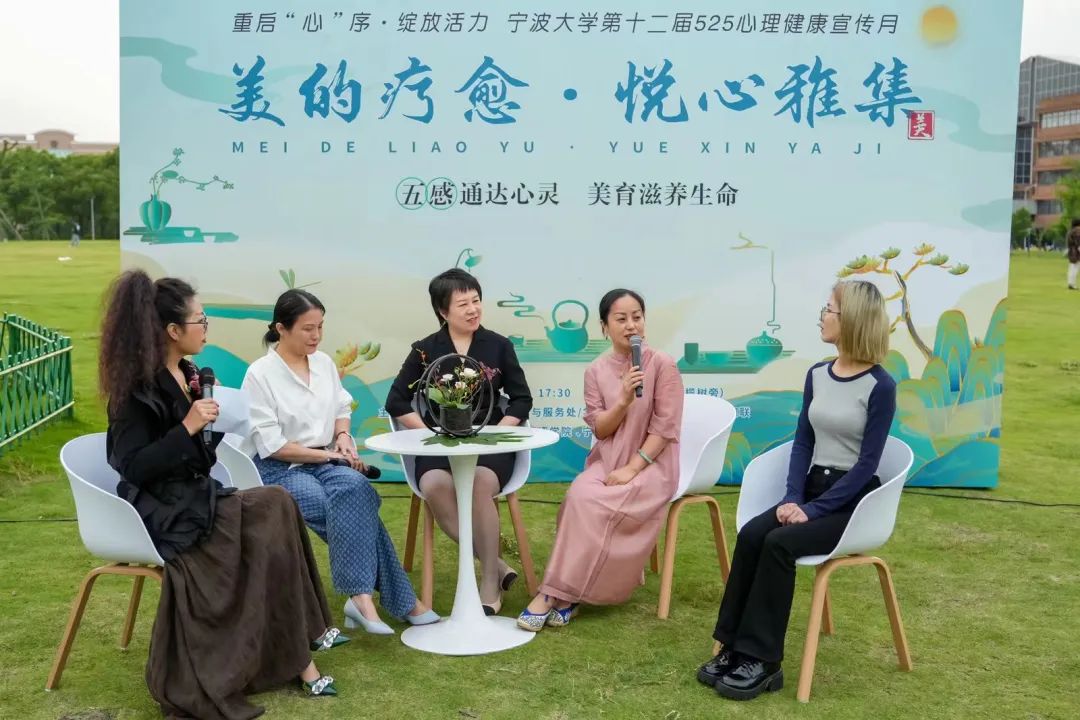 原阳明学院院长、“鹿鸣书友”读书会创始人卢美芬,宁波五一劳动奖获得者、全国绿化奖状获得者、海曙区绿化办副主任、高级园林工程师、高级园艺技师孙立军,国家级高级茶艺师、高级评茶员、“空山谷茶憩文化”创始人曹莉华,国家二级心理咨询师、“知悦”心理工作室创办人廖菁菁等嘉宾,以及学校宣传部副部长王湖清、学生处副处长张海华、心理健康指导中心主任米多、做爱