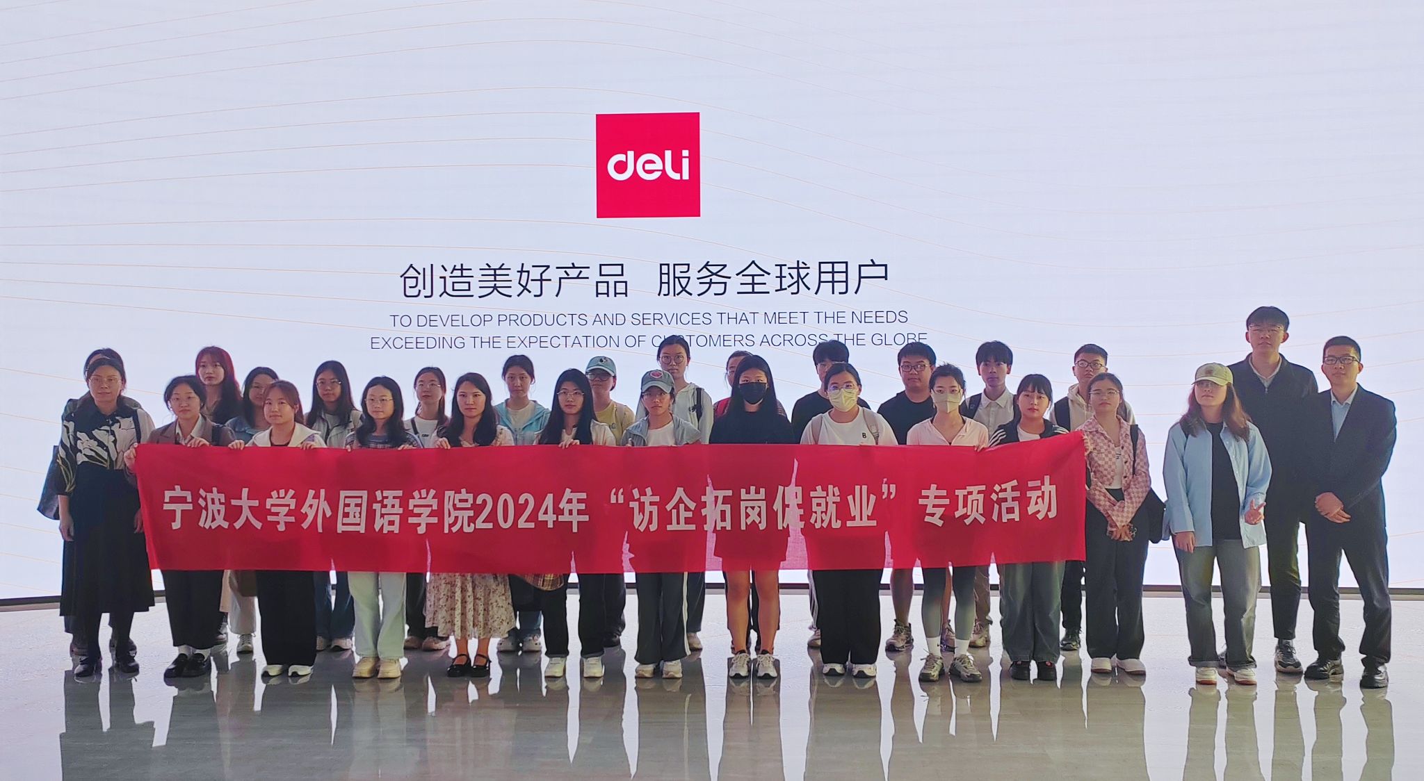 英语系副主任李奕、就业辅导员檀学敏及学生代表共30余人赴得力集团宁海总部开展“访企拓岗促就业”专项活动。得力集团培训总监刘俊峰、招聘经理徐旨阳亲切接待。