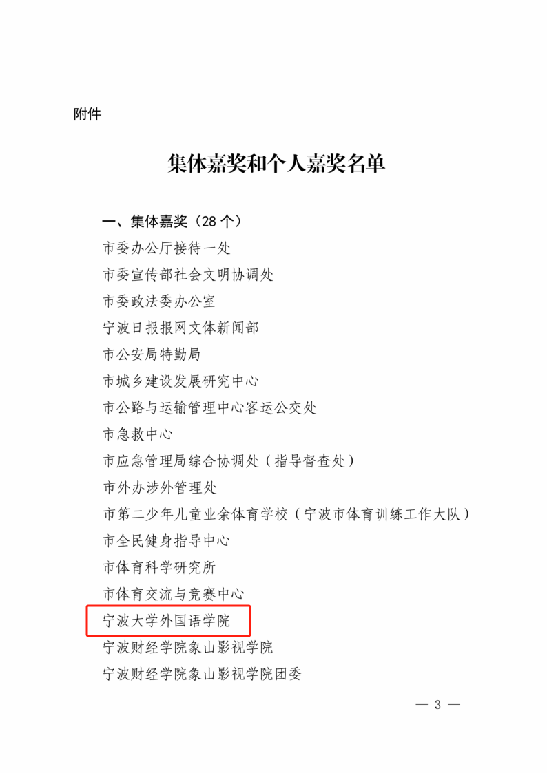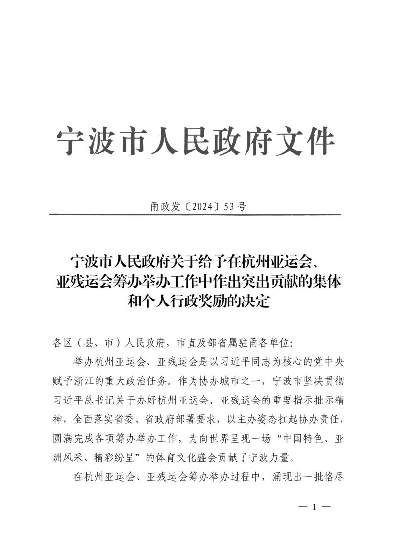 6月29日,宁波市人民政府发布《关于给予在杭州亚运会、亚残运会筹办举办工作中作出突出贡献的集体和个人行政奖励的决定》,对在杭州亚运会、亚残运会筹办举办过程中涌现出的恪尽职守、无私奉献的28个集体和84名个人给予嘉奖。做爱