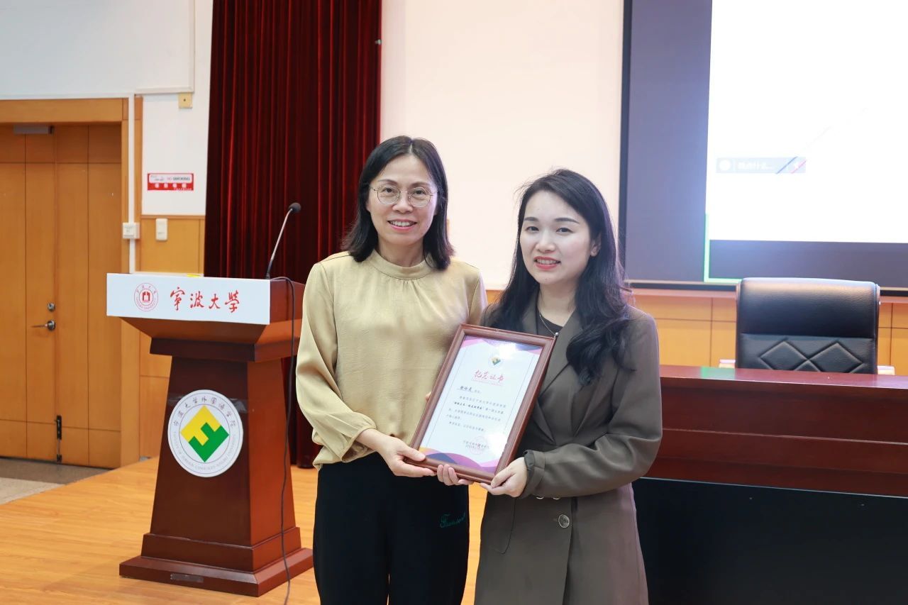 英语系副主任、师范专业负责人李奕在讲座结束后为徐玲灵校友颁发了纪念证书,感谢徐玲灵校友在百忙之中回到母校,为母校同学们分享经验、提出专业性建议。