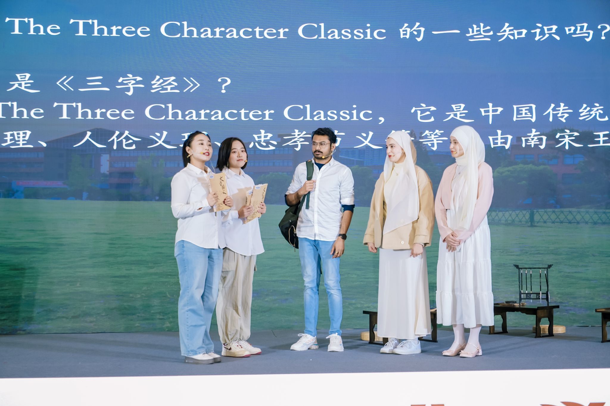 《三字经》情景剧由团队成员自编自导自演,历经两个多月的排练和打磨,通过古今对话、中外学生文化交流的形式,将《三字经》中的教育理念、道德准则和文化智慧融入情境故事中,不仅让观众感受到了中华传统文化的独特魅力,还帮助大家更深入地理解《三字经》作为蒙学经典的教育意义。情景剧的导演及编剧王昕雨说:“筹备这个情景剧很辛苦,两个多月以来,不间断地排练打磨已经成为团队成员们的常态,但大家乐在其中,希望通过这个情景剧让更多的人意识到《三字经》等中华蒙学经典的重要性,也希望以情景剧这种创新的形式让大家看到不一样的蒙学。”