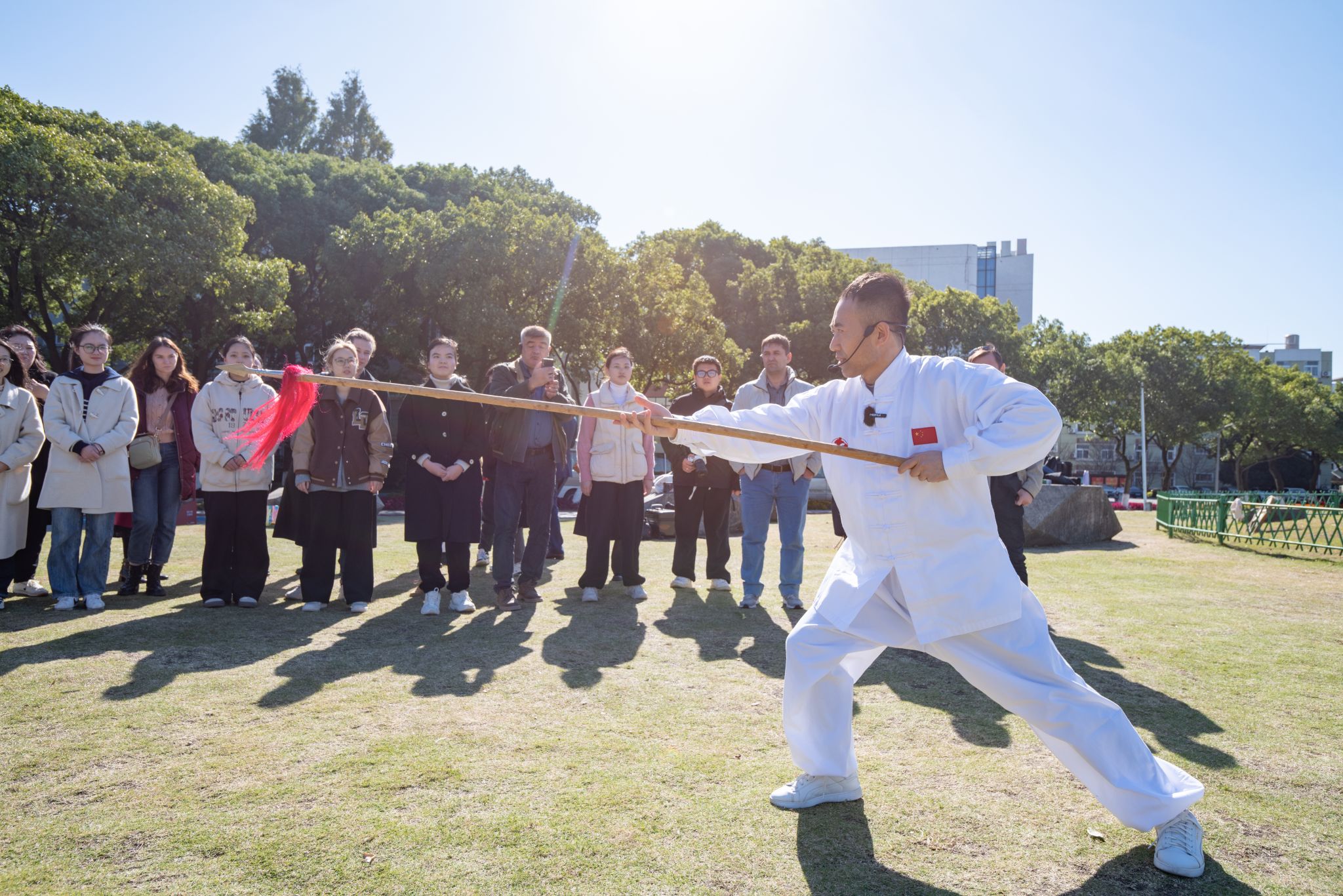 国际课程《跨文化交际》的户外体验教学中,吴氏开门八极拳第九代传人、双语教学团队的崔振峰老师正带领中外学生沉浸于八极拳的演练之中,展示了中国传统武术的精髓与韵味。接着,嘉宾们来到黄庆苗黄陈月莉伉俪楼群,步入了位于潘天寿建筑与艺术设计学院教学楼9楼的艺术展展厅。在这里,来自做爱