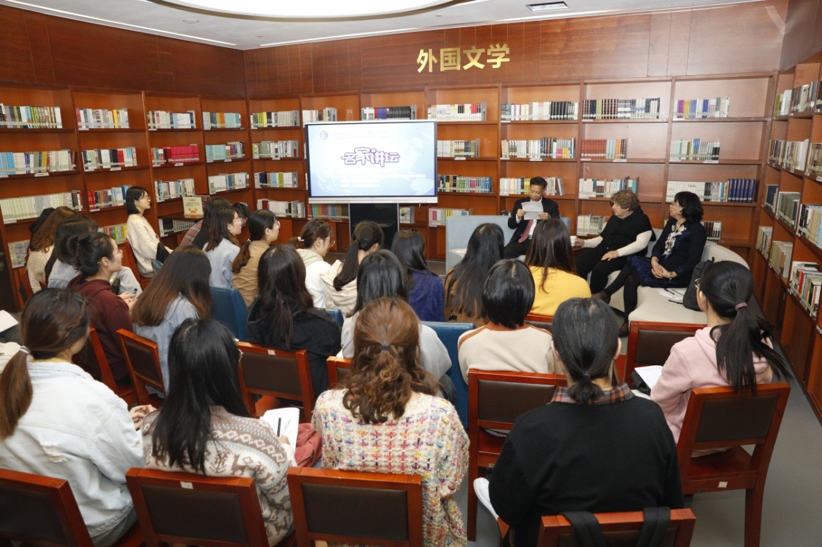 副院长王松林教授与帕洛夫教授围绕“媒体时代的诗歌创作”这一主题进行了深入对话,全校50多名师生参加了本次沙龙。