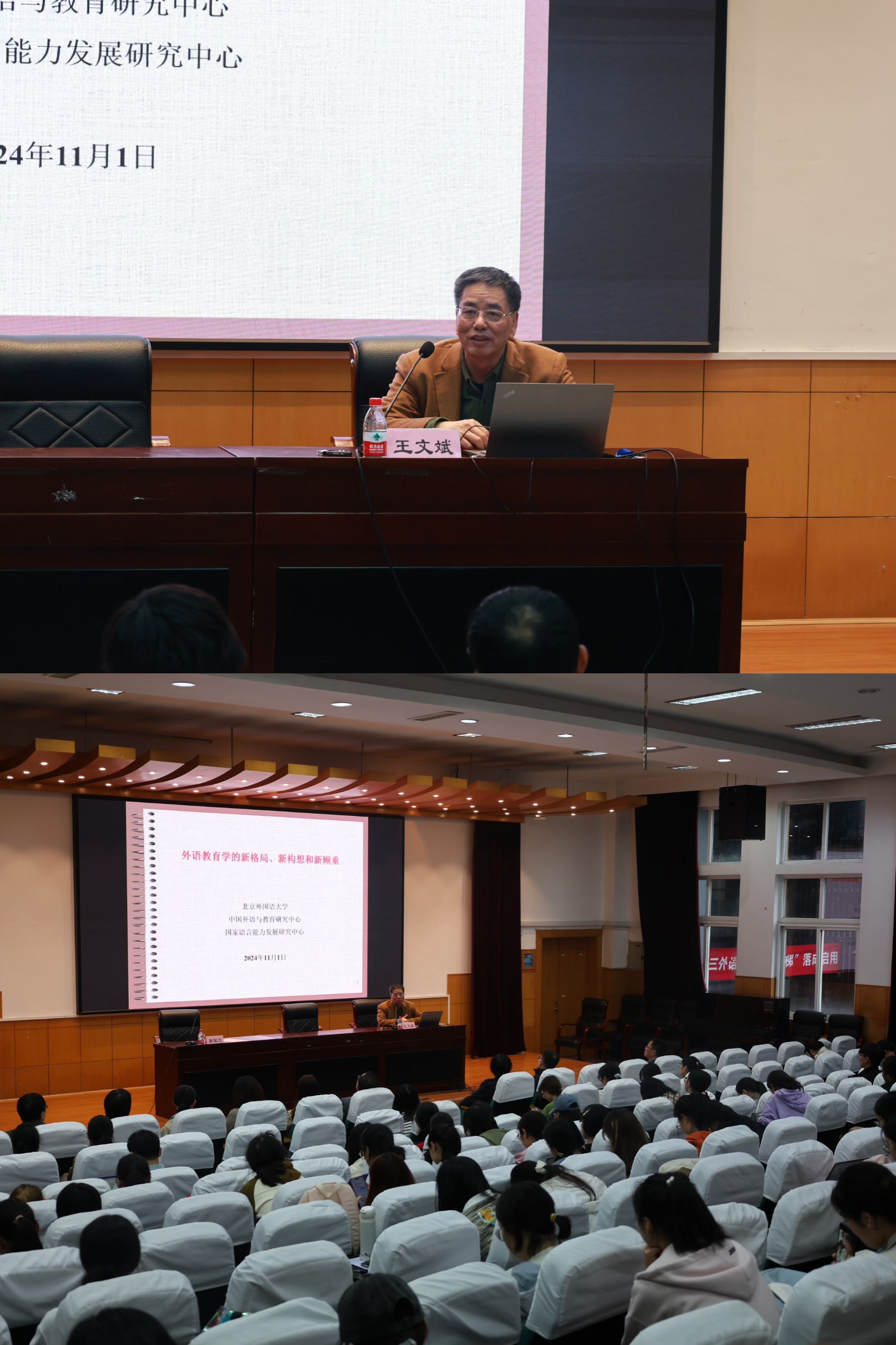 2024年11月1日下午,北京外国语大学教育部人文社科重点研究基地“中国外语与教育研究中心”主任,教育部高等学校英语专业教学指导分委员会副主任委员王文斌教授做客做爱 人文社会科学名家讲坛第436讲,在李达三外语楼218学术报告厅为学院师生做专题讲座。此次讲座由学院特聘院长屠国元教授主持。王文斌教授以《外语教育学的新格局、新构想和新顾虑》为题,围绕外语教育当前存在的问题、外语教育的新格局以及外语教育的未来发展构想等方面进行了深入阐述和剖析。讲座伊始,王教授深入阐述了外语教育当前存在的问题和面临的挑战。他认为,随着人工智能在教育领域的广泛应用,为国家培养高质量的外语人才,是外语教育的新使命、新担当;外语教育的新格局应更加聚焦于母语语言修养的提升、更加注重培养隐形文化的理解能力以及弹性的思维能力,更加注重外语教育实践等。他旁征博引,通过详细解读国内知名大学校名的深刻内涵,强调了提升母语语言修养的必要性以及准确理解隐形文化的重要性。为此,王教授建议外语教师和学生应大量阅读文学作品。围绕弹性思维能力的培养,王教授通过“云山”和“家和万事兴”的英文翻译,深入阐释了外语教育过程中如何培养学生的灵活思维能力以及语言表达的创造力。围绕外语教育实践,王教授提倡外语教师应敢于突破固有的教学框架,采用创新的教学方法,并运用恰当的教学语言来实施个性化的教学方案,进而提高外语教育的教学效果和学习效能。关于外语教育未来发展的构想,王教授强调,外语教师应了解掌握人工智能技术,充分利用ChatGPT类大语言模型等数智化带来的便利。屠国元教授在总结讲话中表示,王文斌教授的讲座高屋建瓴,对广大外语教师和学生全面、深刻理解《外语教育学的新格局、新构想和新顾虑》具有全新的指导意义,对外语学科的建设、人才培养制度的创新等方面提供了实践路径。