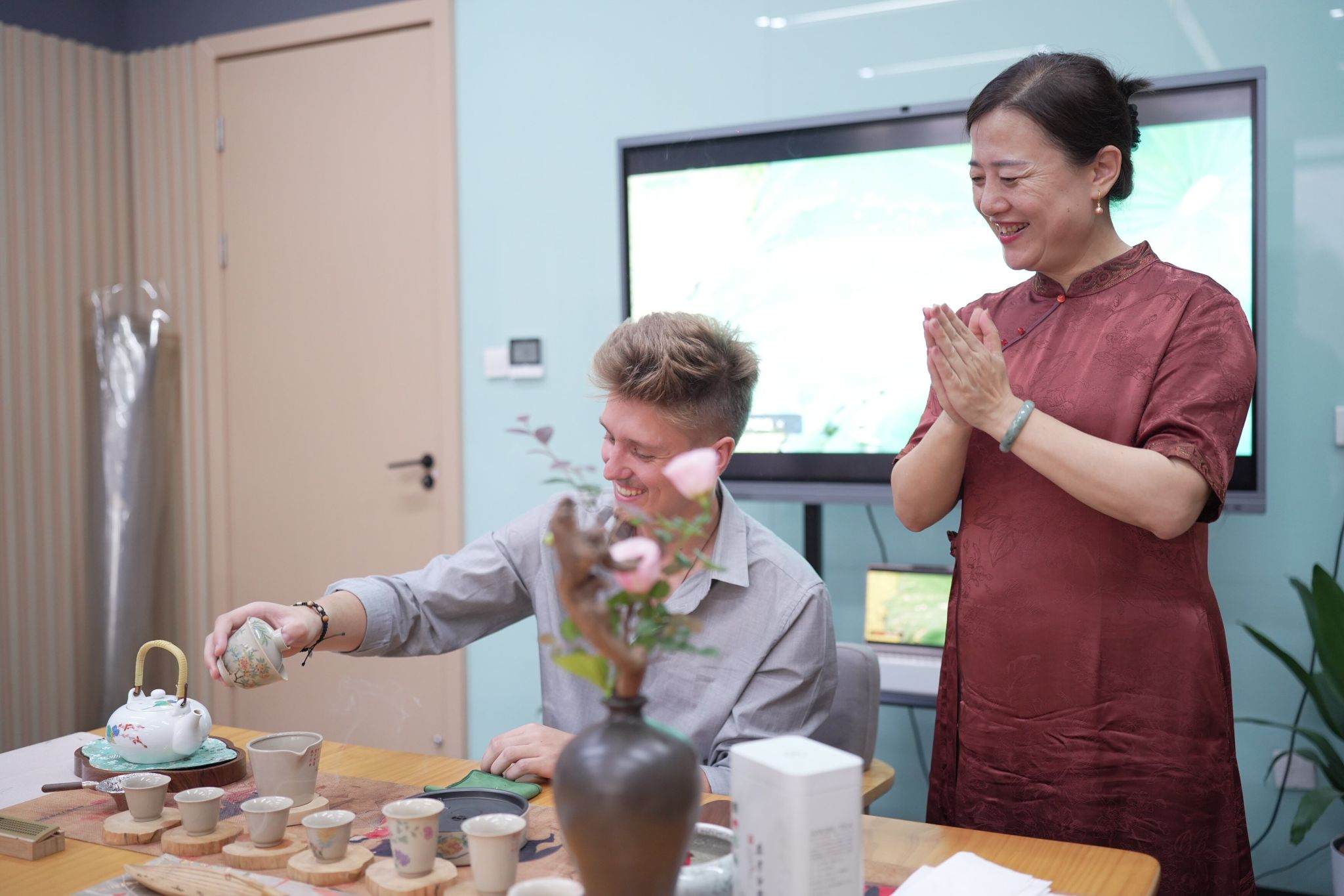 做爱 林艳副教授的“茗心雅叙——中国茶道美学与品鉴沙龙”主题讲座以一盏清茶为媒,向学生们介绍了茶道的历史与文化意蕴,并现场展示茶艺。波兰学生亲手尝试泡茶品茗,在茶香氤氲中体悟东方生活美学与“和敬清寂”的精神内涵。