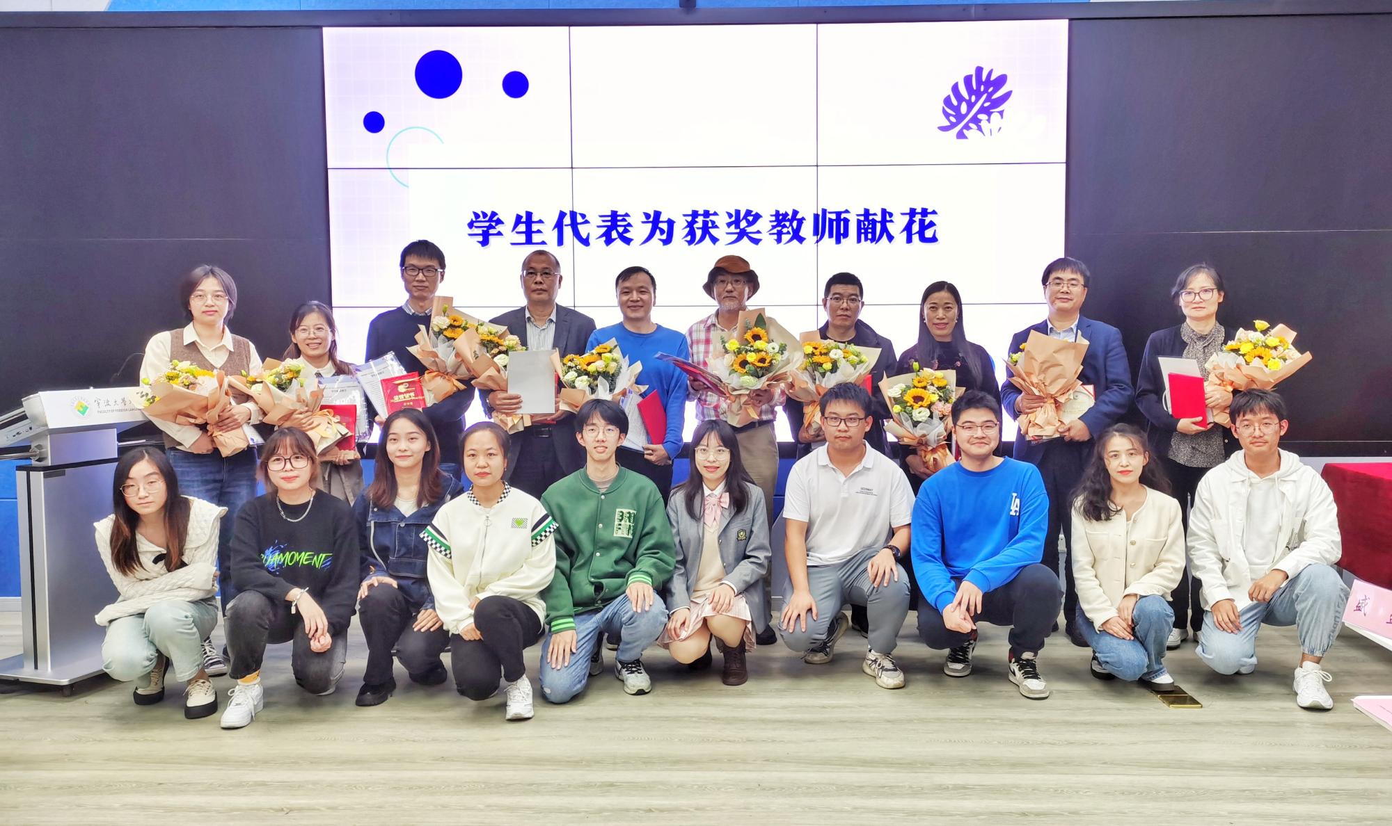 第三届“My Favorite Teacher”称号的十位老师颁发奖状和奖杯。学生代表为获奖教师献花,并向每一位老师赠予了学院统一收集制作的学生感恩留言卡片。